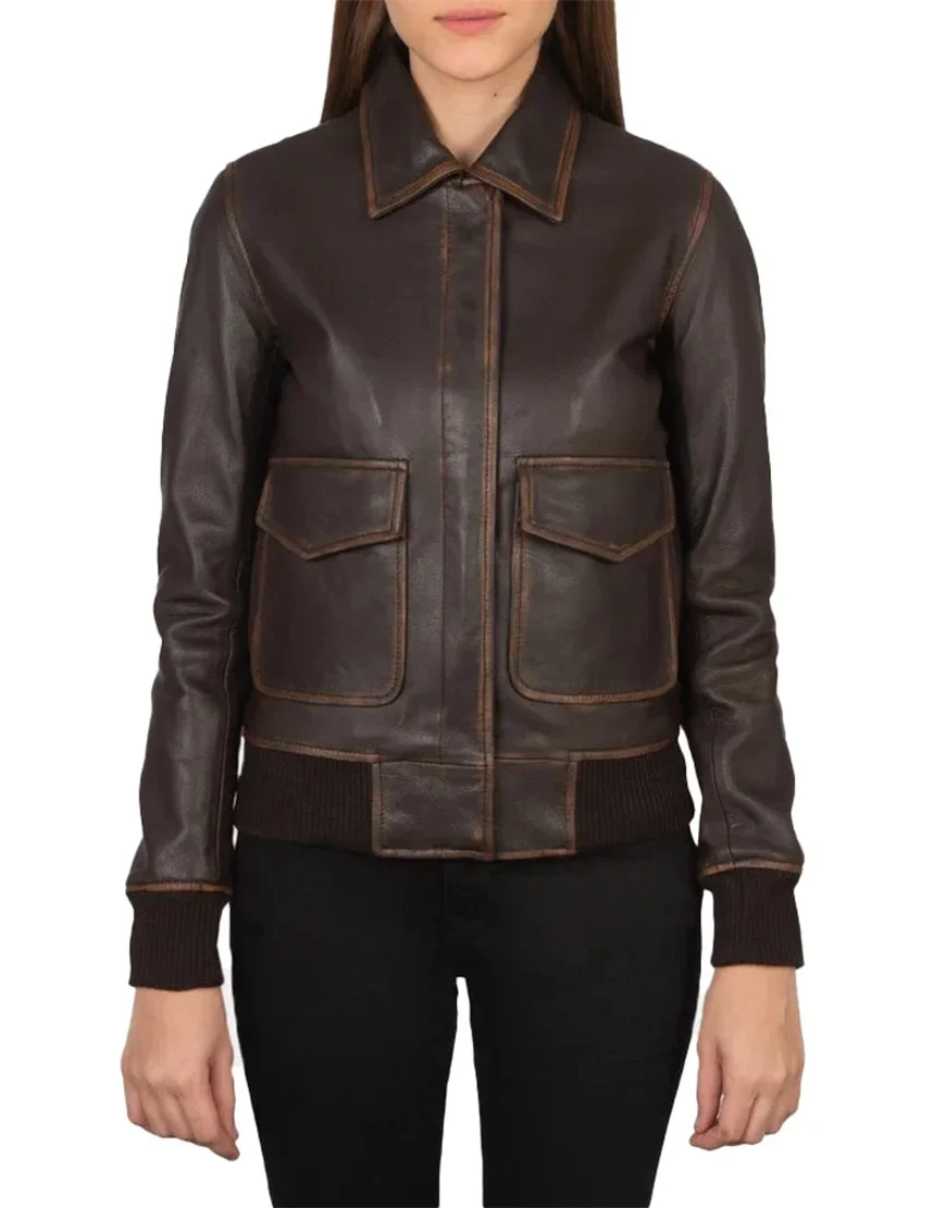 This women’s brown leather bomber jacket features zippered closure with a button flap, four exterior pockets and two interior pockets. The six pockets in total offer ample space to keep your essentials.